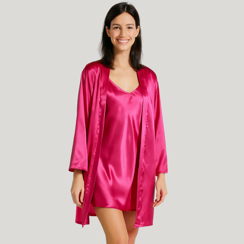 Ten elegancki i zmysłowy zestaw z kolekcji soft&chic został wykonany z miłej w dotyku, połyskliwej satyny. Szlafrok posiada swobodny krój, który idealnie dopasowuje się do ciała oraz szerokie rękawy ¾ . Talię znakomicie podkreśla wiązany pasek, a elastyczny, wysokiej jakości materiał zapewnia wysoki komfort noszenia.