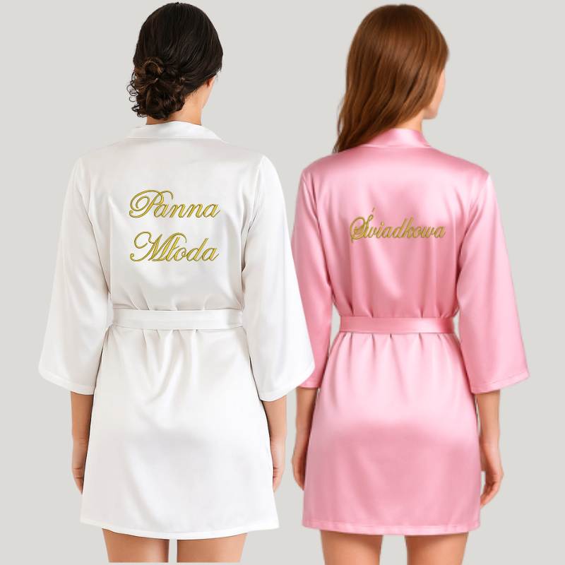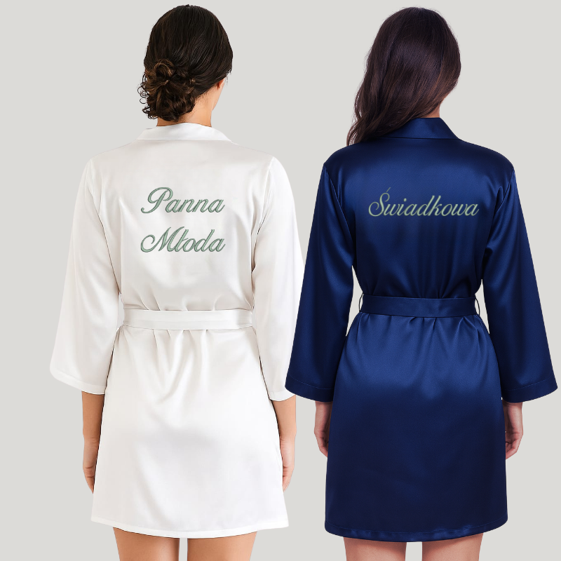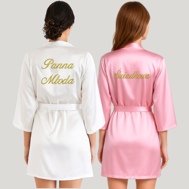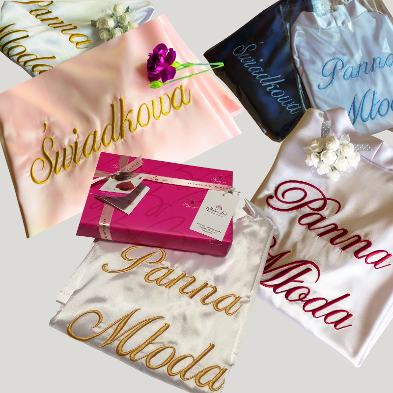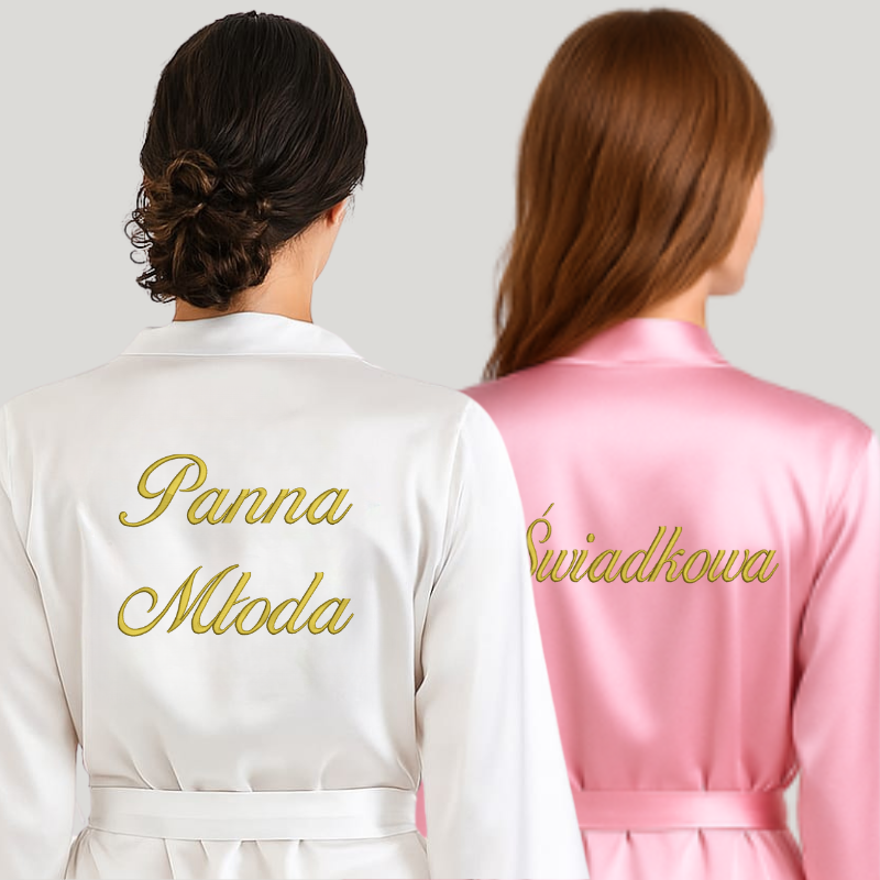 W skład zestawu wchodzą 2 szlafroki z oryginalnym haftem: jeden z napisem Panna Młoda oraz drugi z napisem Świadkowa. Możesz sama zdecydować jaką czcionką i kolorem nici ma być wyhaftowany napis