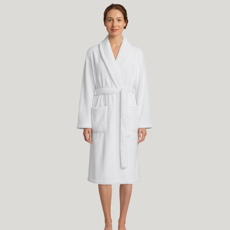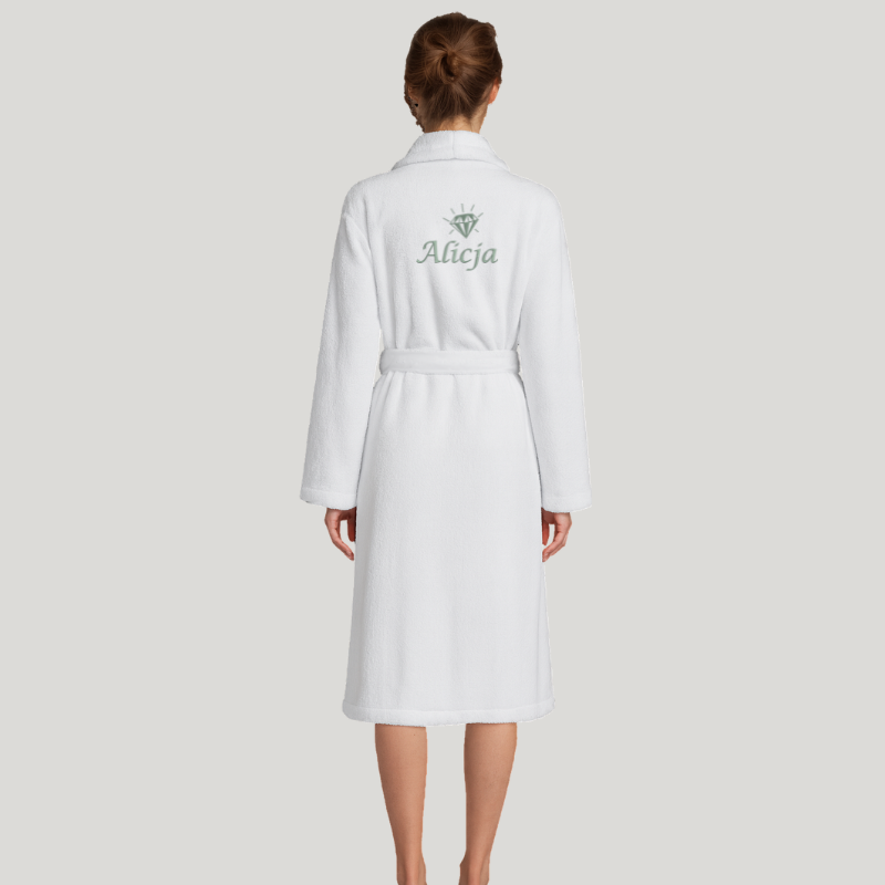 Personalizowany szlafrok damski z bawełny frotte, z szalowym kołnierzem, ozdobiony własnym haftem