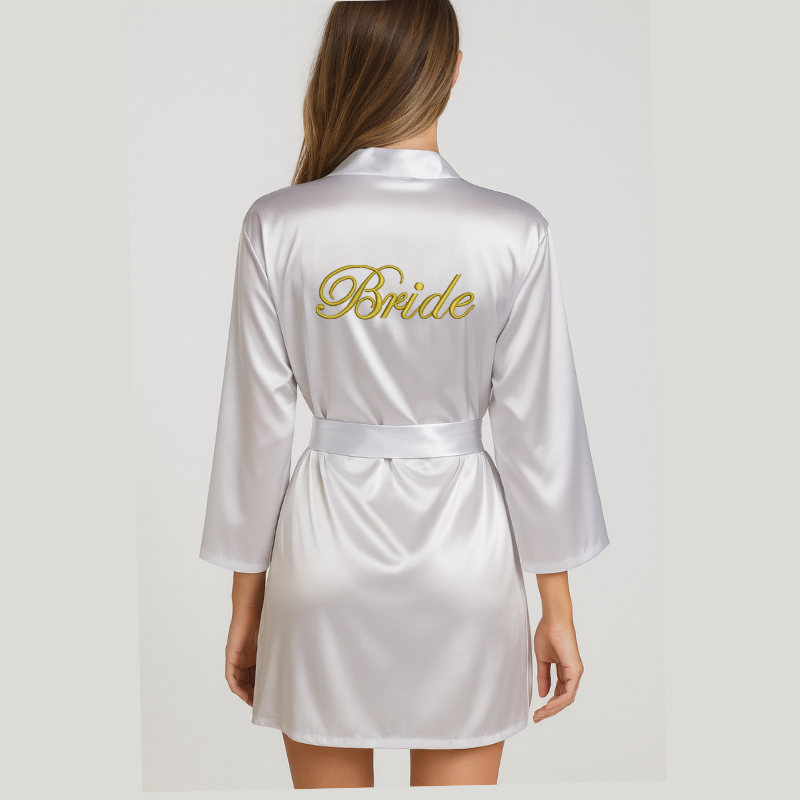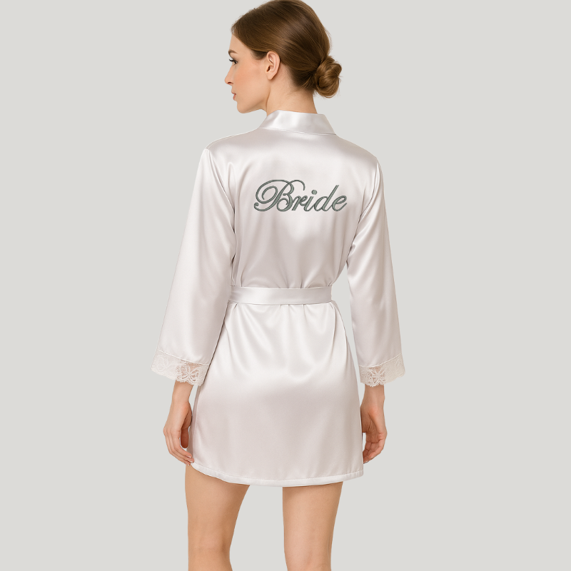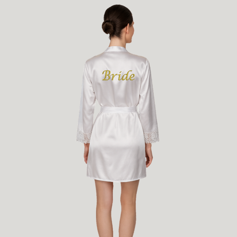 Każdy szlafrok z naszej kolekcji, ma na plecach oryginalny haft Bride. Możesz sama zdecydować jaką czcionką i kolorem nici ma być wyhaftowany napis.